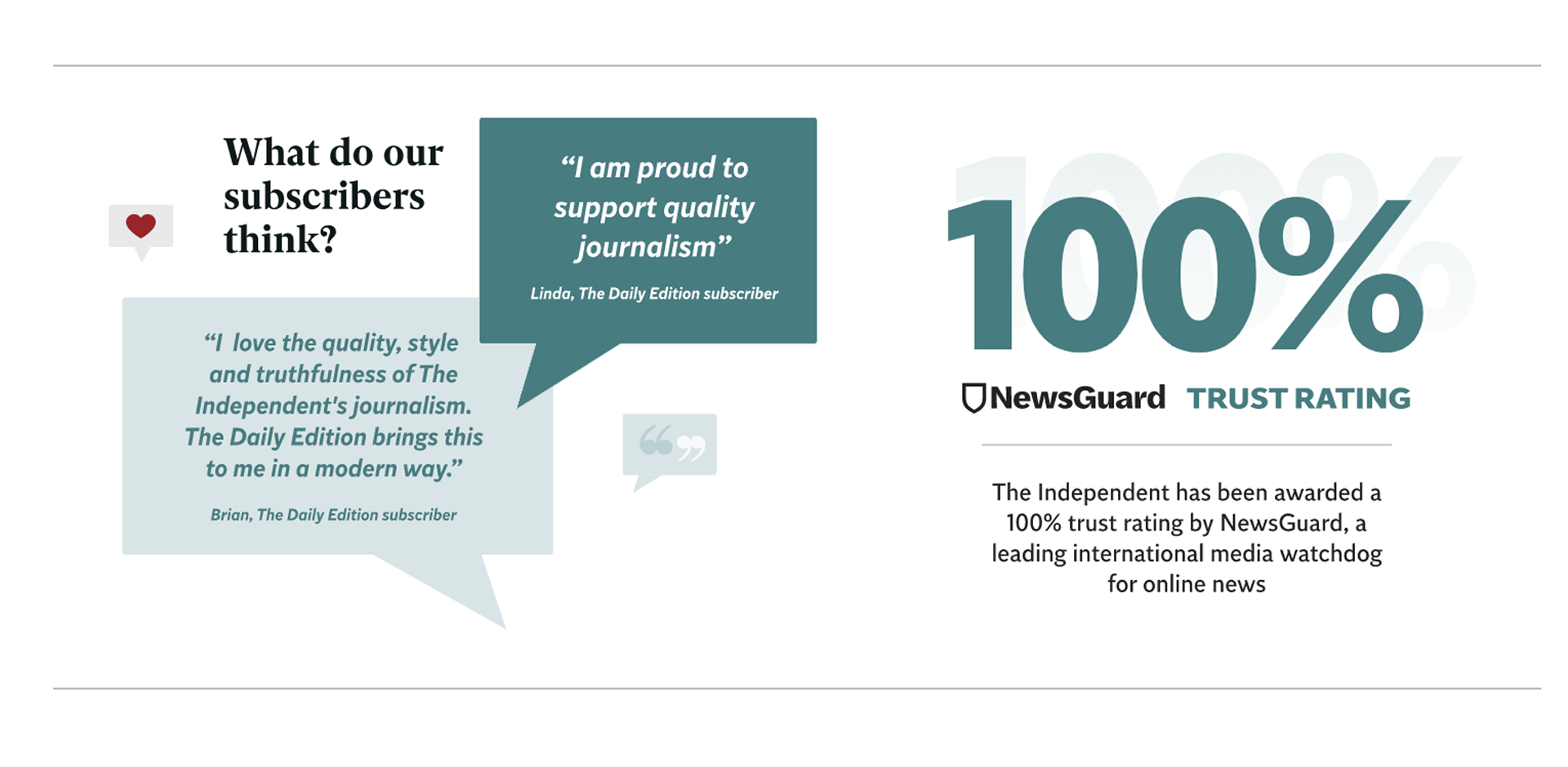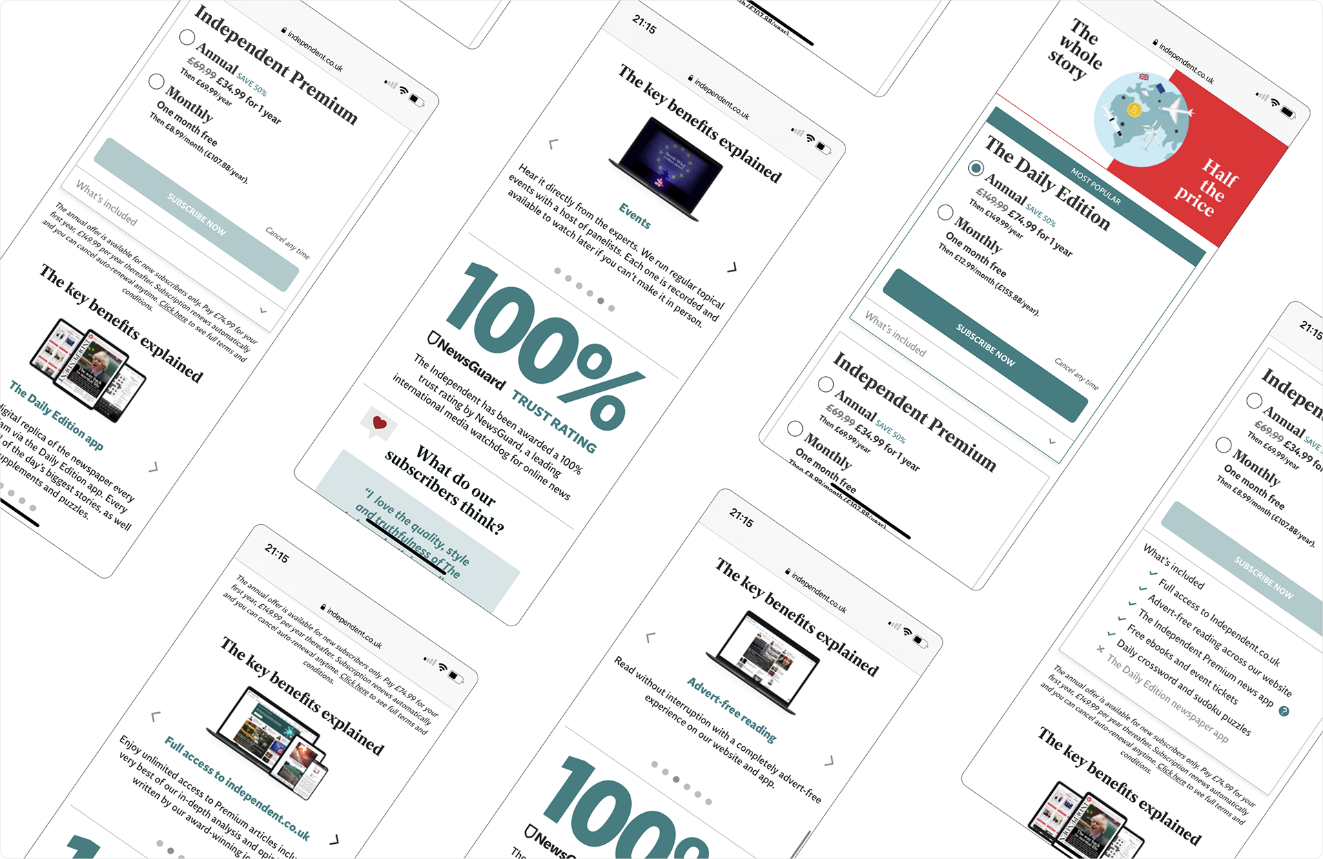 ROLE: I led the UI for The Independent subscription selling page, working closely with UX to conduct user feedback workshops and use the results to improve our user experience. I developed user flows for mobile, tablet, and desktop, creating components and updating our internal design system to ensure consistency over all breakpoints.